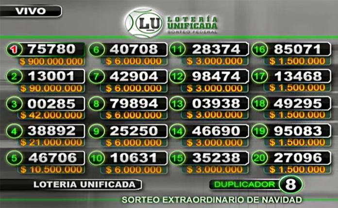 El primer premio, con 900 millones de pesos con duplicador, fue para el número 75780 asignado a la provincia de Jujuy. El duplicador correspondió al número 8.