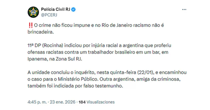 “El crimen no quedó impune, y en Río de Janeiro, el racismo no es un juego”, advirtió la fuerza desde su cuenta oficial de X (antes Twitter).