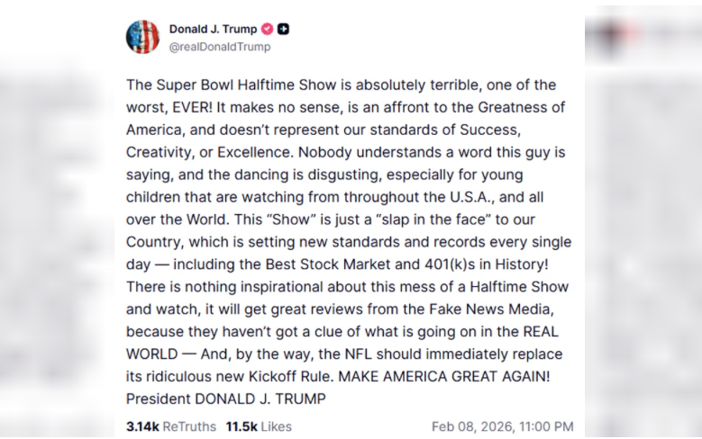 “¡El espectáculo del medio tiempo del Super Bowl es absolutamente terrible, uno de los peores de la historia!”, disparó Trump en su publicación.