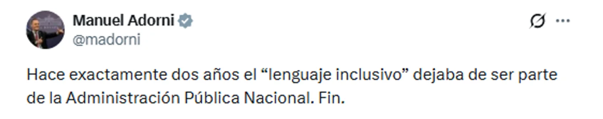 “Hace exactamente dos años el “lenguaje inclusivo” dejaba de ser parte de la Administración Pública Nacional. Fin”, escribió Adorni en el posteo junto a un video en el que se puede ver a ex funcionarios como el expresidente Alberto Fernández y la exministra de Salud Carla Vizzotti pronunciar palabras como “argentines” y “todes”.