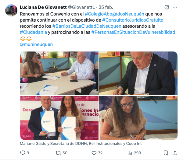 NEUQUÉN (ED). — El consultorio jurídico gratuito que impulsa la gestión de Mariano Gaido volverá a salir a la calle este nuevo por los barrios de la ciudad. Gracias a la renovación del convenio entre la Municipalidad de Neuquén y el Colegio de Abogados y Procuradores de Neuquén, los vecinos y vecinas podrán seguir accediendo a asesoramiento legal sin costo, un servicio que ya demostró dar muy buenos resultados.