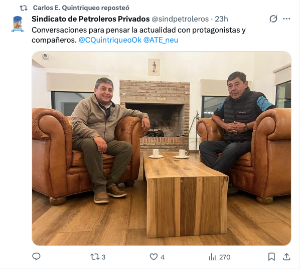 NEUQUÉN (ED) — La reciente foto del secretario general de ATE y referente de Más por Neuquén, Carlos Quintriqueo, sonriente y relajado en un sillón junto al líder de Petroleros Privados, Marcelo Rucci, no fue casual en el mapa del poder neuquino.